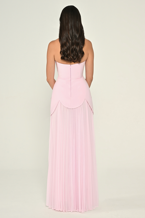 This strapless dress features a structured corset peplum that enhances the waistline with a sleek silhouette. Delicate pearl chain detailing adds an elegant touch, while the pleated skirt provides graceful movement and texture. Designed for a refined, sophisticated look, it perfectly balances classic elements with modern details.
