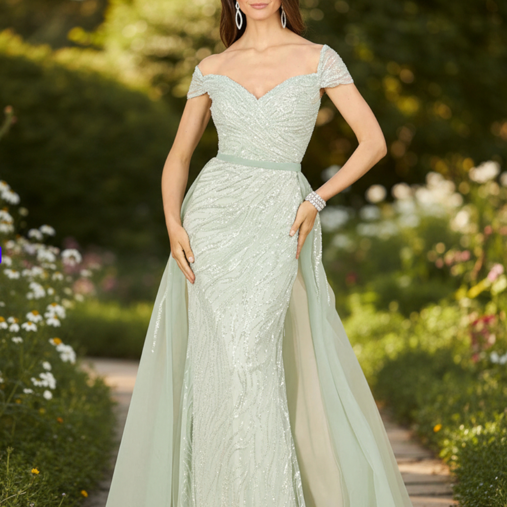 Elevate your evening wardrobe with this sophisticated off-shoulder gown, expertly designed to flatter your silhouette. The fitted bodice features delicate cap sleeves and an elegant off-shoulder neckline, while the showstopping overskirt showcases intricate beading and embroidery that creates a refined linear pattern—a masterful design choice that enhances your natural curves. Crafted from premium polyester lace over polyester lining, this imported piece offers both luxury and practicality with a discreet back zip and professional dry-clean care instructions. Perfect for formal occasions, galas, or black-tie events where timeless elegance is paramount.