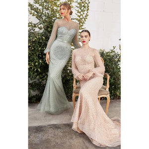 Look modest chic in this pearl beaded long-sleeve dress with fitted skirt by Andrea & Leo A0997.