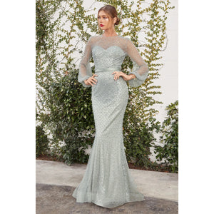 • Illusion sweetheart bodice secured with sheer blouson long sleeves