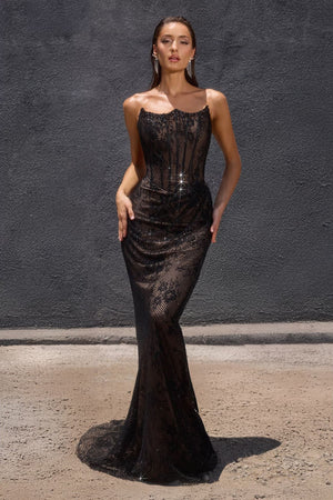 The Ladivine CB162 gown is a masterful blend of elegance and daring design. Featuring a fully beaded, fitted silhouette, it enhances your natural curves with precision. The strapless scoop neckline combined with a shimmering mesh overlay delivers a refined yet captivating look. A sultry leg slit introduces an element of bold sophistication, making this gown an expert choice for making a lasting impression at any high-fashion event.