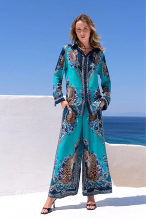 Elevate your wardrobe with the Blue Tigress Women Shirt, crafted from luxurious viscose silk for a soft, breathable feel. Featuring a button-down design in captivating shades of blue, it showcases intricate floral prints and bold tiger motifs, hand-embellished with sparkling crystals for a unique touch. The cuffed sleeves and relaxed fit ensure comfort and effortless style, making it perfect for both casual outings and special occasions. Embrace elegance and confidence with this standout piece.