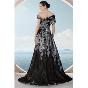 This JANIQUE gown exudes elegance with its one shoulder design and metallic floral details. The fitted silhouette adds a touch of sophistication, making it perfect for any formal event. Elevate your style with this stunning dress.