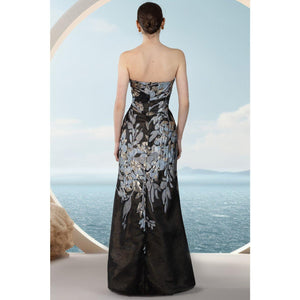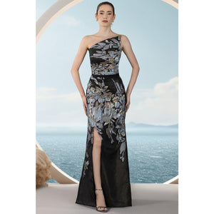 This JANIQUE gown exudes elegance with its one shoulder design and metallic floral details. The fitted silhouette adds a touch of sophistication, making it perfect for any formal event. Elevate your style with this stunning dress.