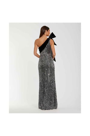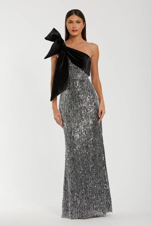 A striking black and silver embellished gown with a graceful trumpet silhouette, shimmering striped sequins, and a dramatic one shoulder velvet bow detail.
