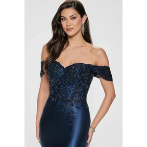 This stunning Mikado gown is a perfect blend of classic elegance and modern flair. The off-the-shoulder bodice, adorned with sparkling beadwork, beautifully accentuates the neckline and shoulders, adding a touch of romantic charm. The sleek, fitted trumpet silhouette flares out into a graceful skirt, with a high side slit for a hint of drama and movement. And the best part? This gown features side pockets—perfect for keeping your essentials close at hand while maintaining a chic and polished look. Whether you're gliding across the dance floor or making a grand entrance, this gown is designed to make you feel effortlessly glamorous.