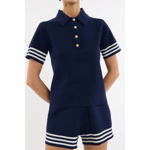 Crafted from a stunning knit fabric, the Mayflower Top by Rebecca Vallance features elegant navy and white detailing enhanced by distinctive gold buttons. This expertly designed piece offers both comfort and refined style, perfect for elevating your wardrobe with a sophisticated, modern edge.