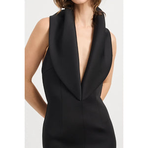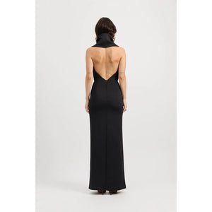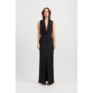 This maxi dress features a halter neckline and is crafted from lightweight scuba neoprene fabric. It showcases a plunging V neckline and a low back for a striking silhouette. The design includes a central front split and a functional zipper at the back. The dress is fully lined for comfort and quality finish.