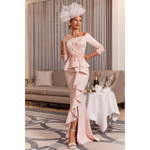 Exude elegance in this floor length dress with soft flowing ruffles that cascade down the skirt to elongate your frame and provide the illusion of height. The wide bardot neckline balances the peplum waist, flattering all shapes, and creating an exquisite hourglass shape. Finished with delicate embroidered floral detailing on the bodice, which is continued on the 3/4 quarter sleeves.