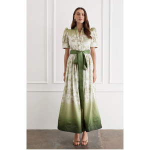 The Rosalie Dress embodies a modern twist on a classic silhouette. Woven from the strength of Cotton and the decadent fluidity of Mulberry Silk, allowing it to hold both structure and softness. A bold cascading skirt is met with the delicate detailing of custom luminescent pearl buttons - combining both function and flare.