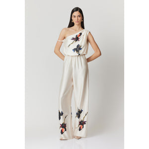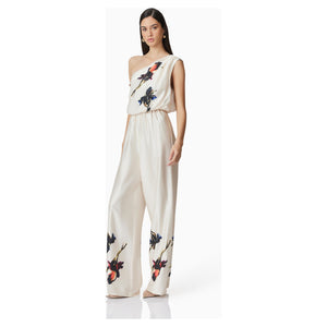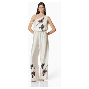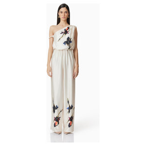 Introducing CURAAE's stunning CECILIA JUMPSUIT, featuring a gorgeous ivory iris print and stunning one shoulder detailing. Perfect for making a statement at any event. Elevate your style with this eye-catching and elegant jumpsuit.