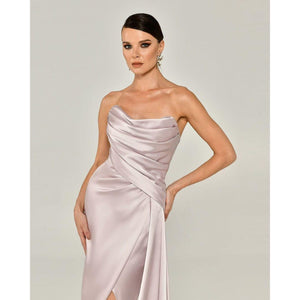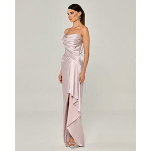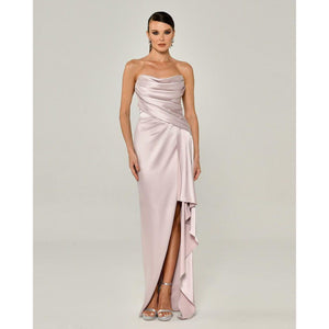 This versatile strapless dress features a stylish side ruffle for a touch of elegance. Made from high-quality materials, it offers a comfortable fit and can easily be dressed up or down for any occasion. The perfect addition to any wardrobe.