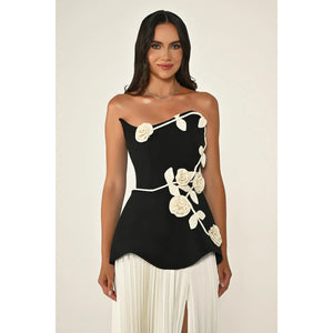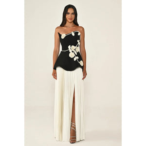 This strapless corset dress combines a sleek black top adorned with delicate floral detailing and an off-white pleated skirt. The fitted corset silhouette offers structured support and shapes the waist, while the pleated skirt adds graceful movement and elegance. Perfect for formal occasions, this dress balances bold design with refined femininity.