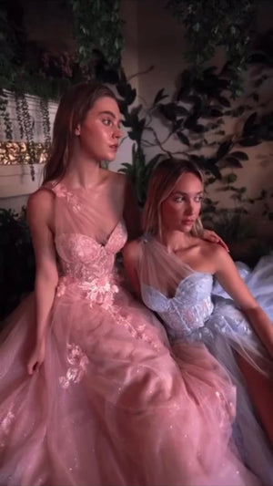 A soft tulle skirt with a bustier bodice and one shoulder neckline. This dress will absolutely be one of our best styles for 2022!