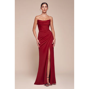 Embrace elegance with this strapless neoprene dress, featuring a scoop neckline and a structured bodice. The gathered waistline gracefully transitions into layers, creating a whimsical and flattering silhouette. Ideal for bridesmaids or wedding guests, this dress ensures a sophisticated and enchanting look for any special occasion.