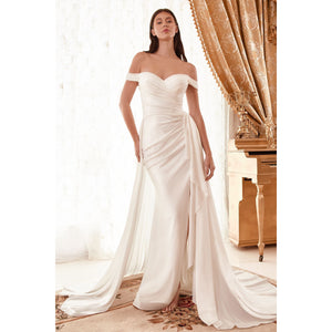 This draped off the shoulder bridal gown is the perfect dress for the simple bride dreaming of her romantic wedding day. Crafted from a luxe off white stretch satin, this modern and tasteful piece casts grace and elegance. The fitted silhouette hugs the body and leads to an attached tiered overskirt that cascades in grace. The gathered waistline adds a classic touch while the leg slit affords a subtle glimpse of skin as you glide through the room. To complete the look, a center back zipper closure ensures an effortless fit with maximum comfort. Turn heads on your big day in this beautiful draped off the shoulder bridal gown!