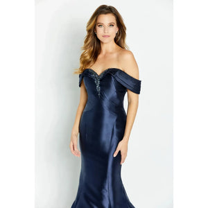 Radiate timeless glamor in this exquisite trumpet gown. Thoughtfully crafted from luxurious Mikado fabric, this stunning style boasts a flattering sweetheart neckline that transitions into elegant off-the-shoulder sleeves. The soft structured bodice cinches the waist, while the trumpet skirt elegantly flares to the floor to create a showstopping silhouette.