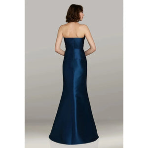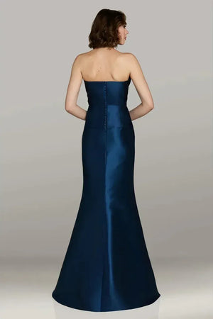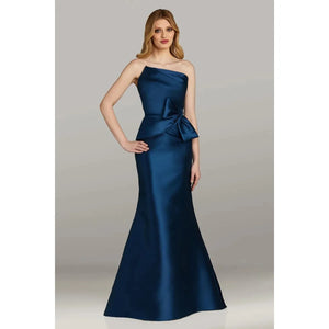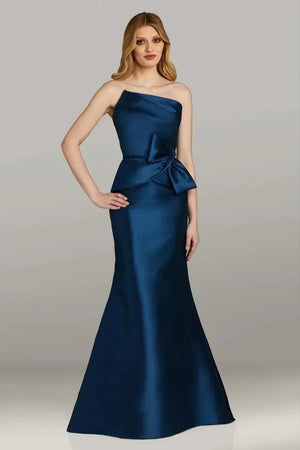 This stunning full-length gown showcases an elegant strapless design in a rich teal hue. The asymmetrical top adds a modern edge, while the bow twist detailing around the stomach creates a sophisticated focal point that enhances the silhouette. Ideal for formal events, this dress combines timeless style with contemporary flair.