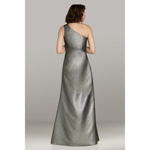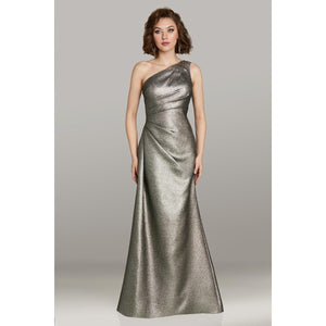 This exquisite gown features a striking one-shoulder design crafted from luxurious textured gold fabric. The subtle ruching at the stomach enhances the silhouette, offering a flattering and elegant fit. Perfect for making a sophisticated statement, this dress combines refined details with a radiant finish to elevate any formal occasion.