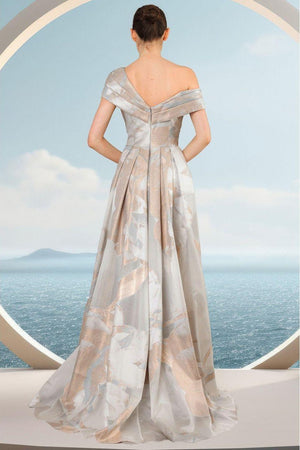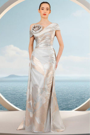 Be the definition of elegance and style in the Janique 2515 ensemble, where luxury is carefully woven into every detail. This gown showcases impeccable tailoring on a sleek floral-printed silhouette, with metallic-like detailing for a sophisticated touch. The asymmetrical neckline, featuring rosette and foldover accents, creates a unique and striking look. Pleated elements on the bodice add depth and texture, while the asymmetrical open back with a zipper closure brings modern flair. The sheath skirt seamlessly blends into an overskirt, with a sweeping train that amplifies the dramatic effect. Perfect for creating a bold yet elegant statement at any special event, the Janique 2515 is designed for the woman who seeks the utmost in style and sophistication. Model is wearing the Taupe colour.