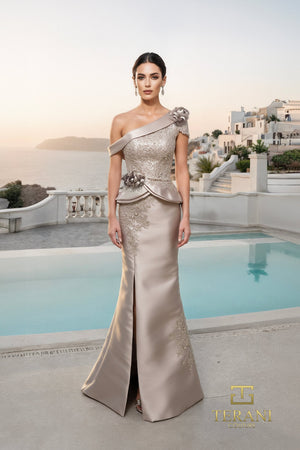 Elevate your formal wardrobe with the TERANI 261M6408 Asymmetric Peplum Sheath Gown, a masterclass in refined sophistication. This long sheath design combines luminous Mikado with delicate lace, balancing structure and femininity beautifully. The asymmetric neckline adds contemporary edge, while the sculpted peplum accent at the waist defines and flatters your silhouette. This sleeveless gown features a 46″ sheath skirt with a graceful front slit for effortless movement. A concealed centre-back zipper with hook-and-eye closure ensures a flawless fit, allowing you to move with confidence and understated allure.