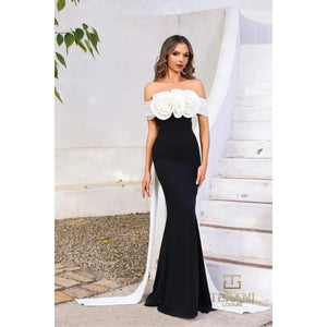 Fabric & Embellishment: Crafted from high-quality crepe fabric, this gown boasts a rich, matte finish with a soft, luxurious feel. The exquisite fabric roses on the shoulder add a striking yet delicate embellishment, giving the dress a couture-like quality.