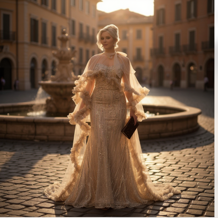 Elevate your formal wardrobe with the AD | KATINA, a beaded evening gown designed for sophistication and grace. This gown features intricate beadwork that catches the light beautifully, paired with a separate sheer over-cape that adds a delicate, flowing layer of elegance. Perfect for making a refined statement at any special occasion, the combination of structured embellishment and ethereal overlay offers a timeless, expert-crafted silhouette.