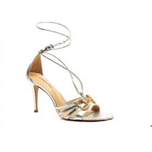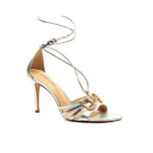 Shine from every angle in the Luna Luxe Chain Sandal. This metallic silver heel features delicate wrap-around straps and a glamorous gold chain embellishment across the front. The stiletto heel and strappy design offer a head-turning finish, making this the ultimate shoe for parties, celebrations, or upscale evenings.
