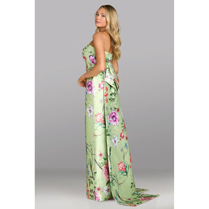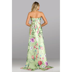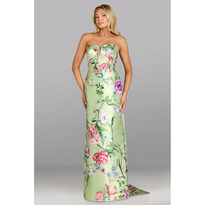 Elevate your evening wardrobe with this exquisite strapless gown, featuring a captivating floral design rendered in soft pastel tones with striking green accents. The sophisticated silhouette and refined colour palette create an effortlessly elegant look, perfect for formal occasions where understated luxury speaks volumes. A timeless piece that combines contemporary design with classic appeal.