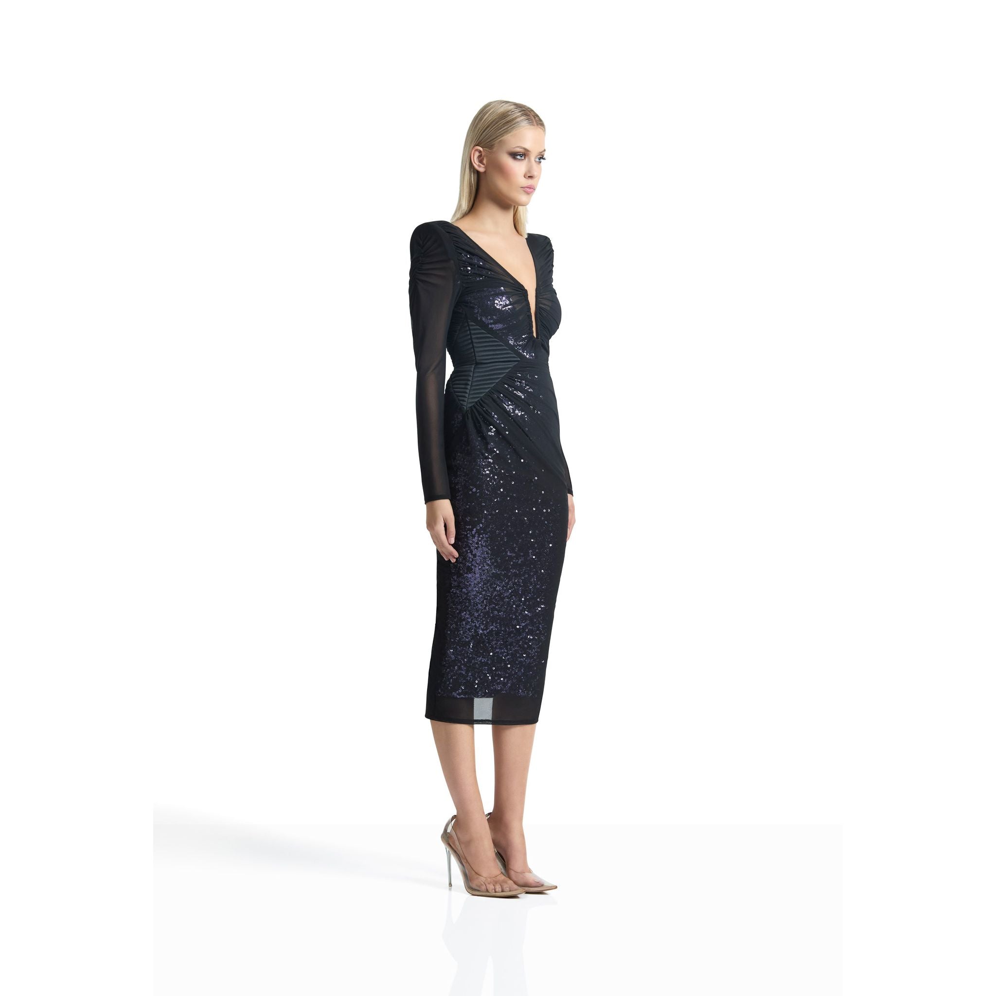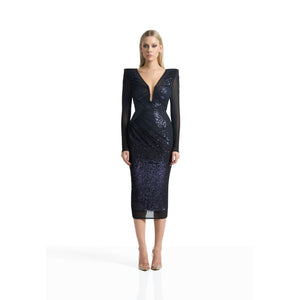 Elevate your evening repertoire with this sophisticated navy midi dress from ZHIVAGO. Crafted with luxurious sequin detailing, the design captures light beautifully for an understated glamour. Strategic ruching through the silhouette creates flattering dimension and movement, while the mid-length cut offers refined versatility. A discreet back zip ensures effortless dressing. Perfect for cocktail events, celebrations, or upscale occasions where polished elegance is paramount.
