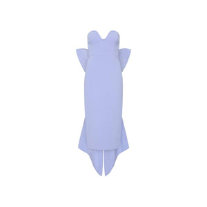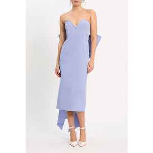 Make a stunning impression in the Annabelle Strapless Midi Dress in Powder Blue. Crafted from crepe fabric, this dress features a plunging sweetheart neckline and a boned bodice, ensuring a flattering and structured silhouette. The pencil midi skirt exudes elegance, while the back split adds a touch of allure. The statement taffeta bow with long tails also creates an eye-catching detail. Designed with a zip fastening at back and a lined interior.