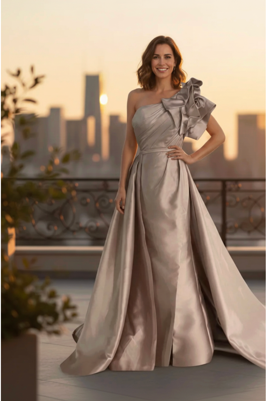 Our latest Mother of the Bride & Groom couture gown brings all the drama with sculpted satin, a statement one-shoulder ruffle, and a breathtaking dusty rose finish. Every detail is designed for your spotlight moment—because you deserve to shine just as bright as the celebration.