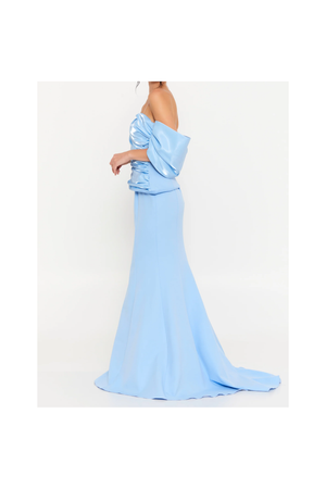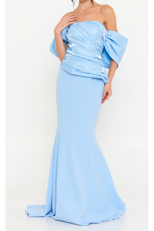 The ALIITA ALVA in blue features elegant cap sleeves and a stunning blend of organza with a crepe finish at the bottom. This combination offers a sophisticated texture contrast and expert craftsmanship for a refined, graceful look.