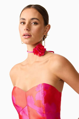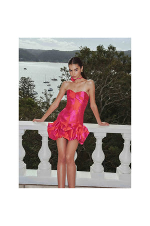 Effortlessly elegant and playfully flirty, the Eloise Strapless Mini Dress in Pink & Red is your go-to look for special occasions, cocktail parties, or a fun summer event. Designed in a structured jacquard fabrication, this sleeveless mini dress offers a luxurious, sculpted fit that holds its shape beautifully. The sweetheart neckline adds a romantic touch, while the rosette tie at the waist brings a feminine and whimsical detail that elevates the overall look.