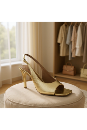 The BRAZILIO | NIKI offers a sophisticated platinum gold high slingback design, crafted to provide an elegant silhouette. Its wide fit ensures enhanced comfort and accommodating wear, making it an excellent choice for those seeking both style and practicality in their footwear.