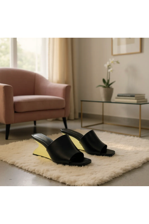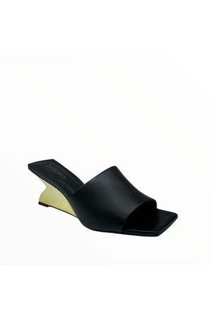 Elevate your style with these statement-making mules featuring a bold, sculptural gold heel. The sleek black upper contrasts beautifully with the metallic base, creating a sophisticated yet futuristic silhouette. Perfect for fashion-forward evenings or upscale daytime looks, these mules are a true blend of art and design.
