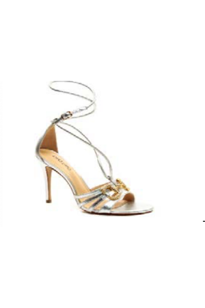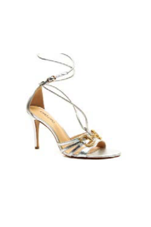 Shine from every angle in the Luna Luxe Chain Sandal. This metallic silver heel features delicate wrap-around straps and a glamorous gold chain embellishment across the front. The stiletto heel and strappy design offer a head-turning finish, making this the ultimate shoe for parties, celebrations, or upscale evenings.
