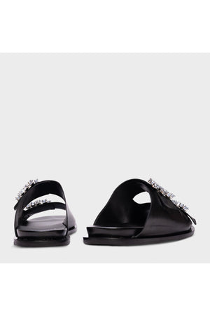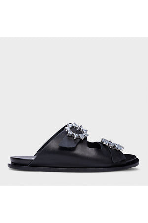 Slip on leather flat. It has two wide straps, one over the instep and the other over the toes. Both have an adjustable buckle with crystal detail