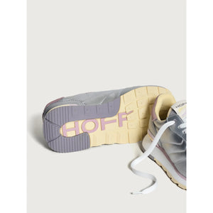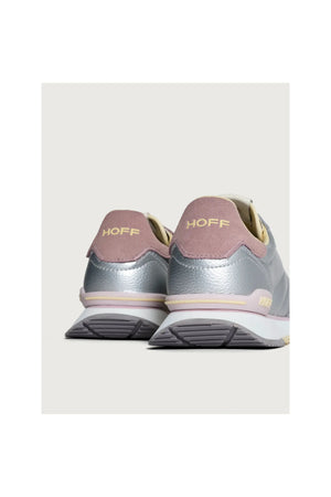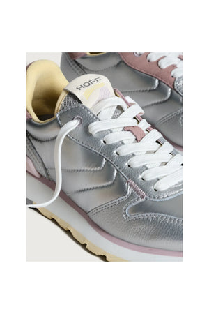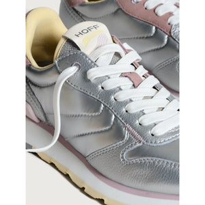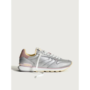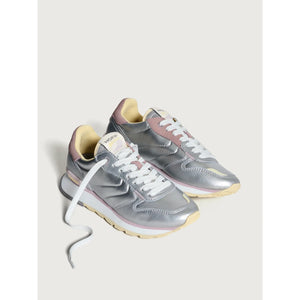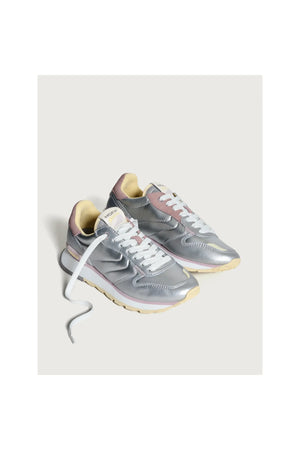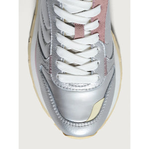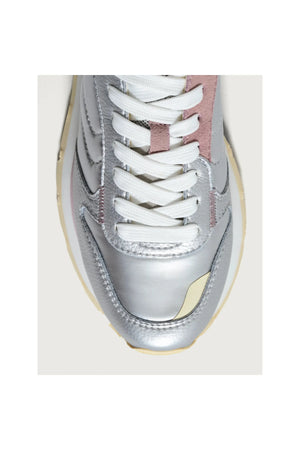 Retro-style sneakers with a metallic finish and a combination of materials. Embroidered logo detail on the back. Closure with laces.