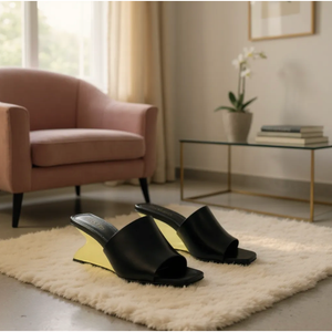 Elevate your style with these statement-making mules featuring a bold, sculptural gold heel. The sleek black upper contrasts beautifully with the metallic base, creating a sophisticated yet futuristic silhouette. Perfect for fashion-forward evenings or upscale daytime looks, these mules are a true blend of art and design.