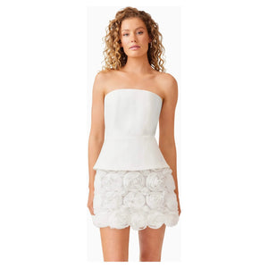 The Selena Strapless Mini Dress in White exudes modern elegance with its captivating design and sophisticated silhouette. This chic mini dress features a flattering strapless neckline, offering a sleek and polished look perfect for any occasion. The corset-inspired top ensures a sculpted and structured fit, beautifully accentuating the waist.