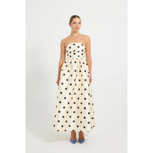 The Dottie Strapless Midi by PASDUCHAS is crafted from a lustrous-finish taffeta and features an exclusive cream and black polka dot print. This strapless silhouette is defined by textural tucks through the bodice that enhance and flatter the shape, while a structured waist seam cinches the figure before falling into a full, voluminous midi-length skirt. Functional side pockets add a modern, practical touch. Lined through the bodice and finished with a centre-back zipper, this style is ideal for statement event dressing.