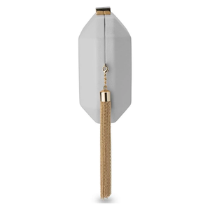 The Lia Facetted Clutch is a total wardrobe staple. Featuring a facetted, smooth vegan leather outer, an optional tassel to add a little drama at a moments notice and a roomy enough interior for all the essentials. Carry this white clutch handbag in the palm of your hand or use the optional shoulder chain to go hands free.