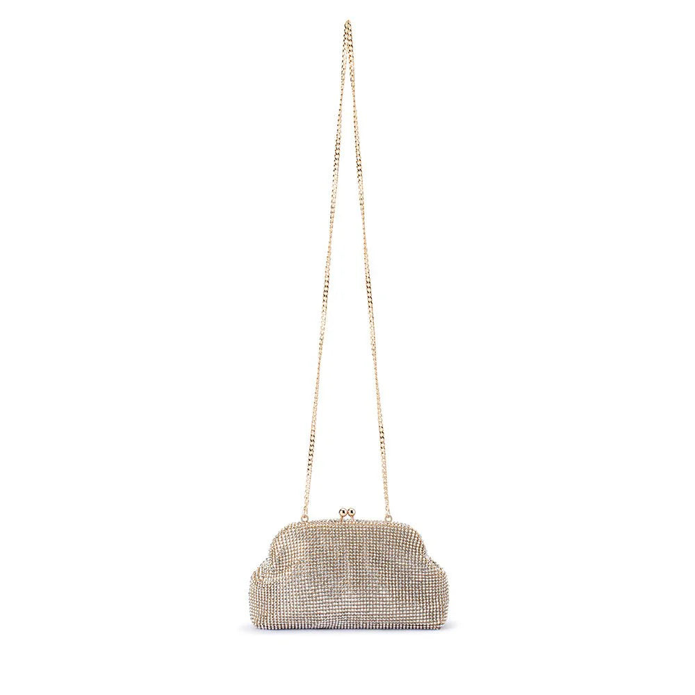 Complete any look with the sparkly ELA Crystal Mesh clutch. An update on a classic Olga Berg shape, this framed style clutch is covered in tiny crystals. It boasts maximum bling and plenty of room inside for all your event essentials, as well as both top handle chain and shoulder chain options for maximum styling versatility.