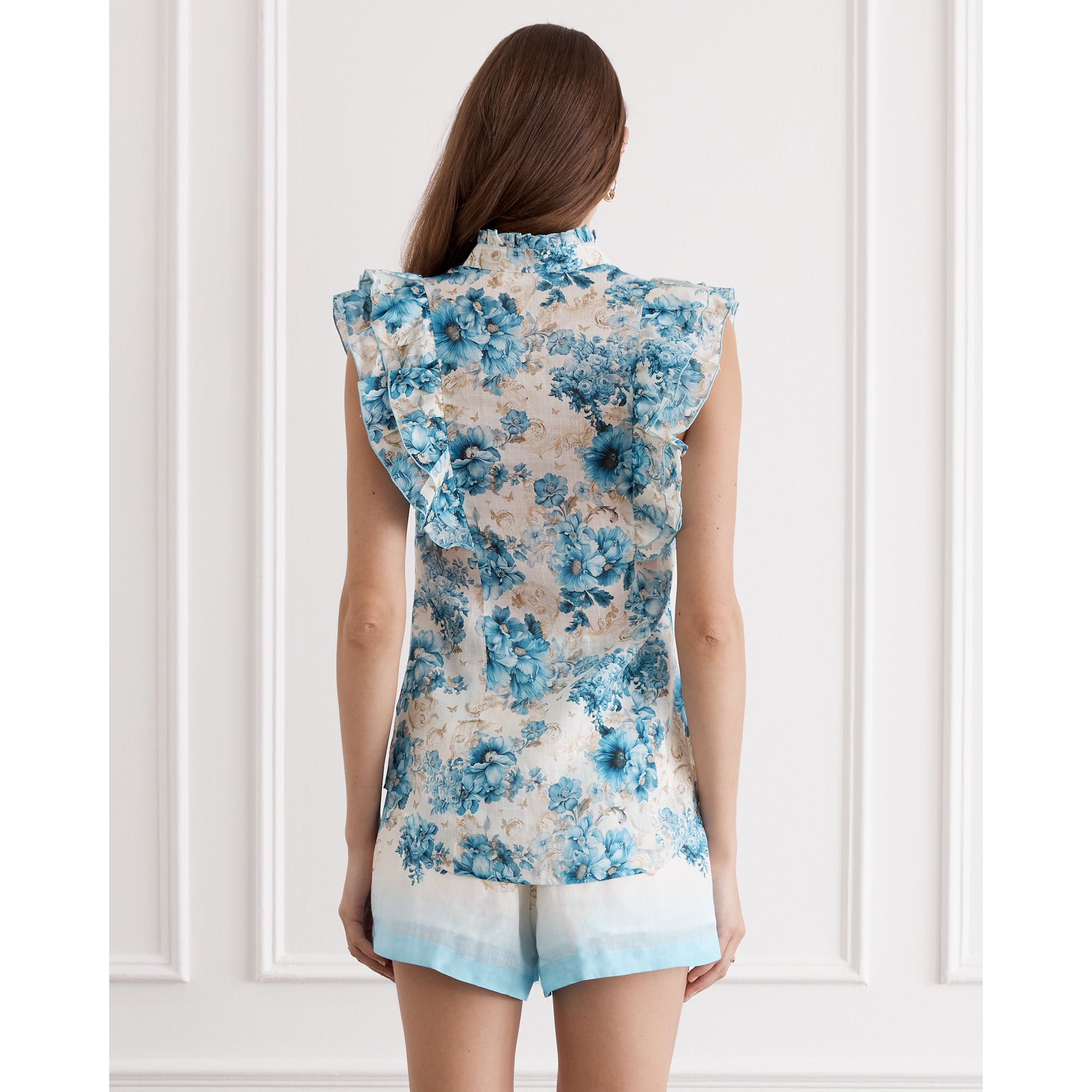 The AQUA BLU Aubrey Top showcases a fresh and elegant blue floral print crafted from premium French flax linen. Featuring delicate ruffle sleeve details, a mandarin collar, and a button-through front, it combines refined design with effortless sophistication. The self neck tie adds a versatile touch, making this top a stylish choice for both casual and polished looks.