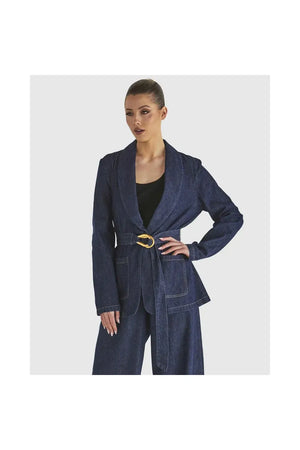 Tailored elegance meets modern edge in the Soaring Blazer, featuring a self-fabric belt with a gold buckle. Functional pockets add practicality, while the fully lined denim fabric creates a structured yet refined silhouette. Designed for a regular fit, this blazer is a polished layering piece. A must-have for contemporary sophistication.
