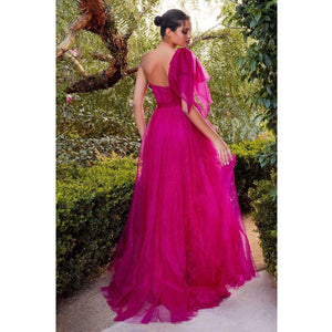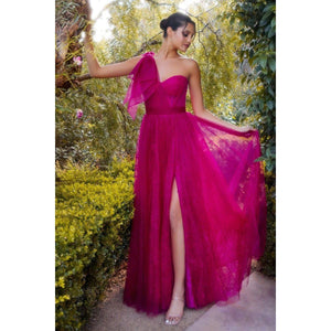 Captivate hearts in our one-shoulder Magenta A-line dress—a romantic symphony of Chantilly lace and cascading layers of tulle. The sweetheart bodice, draped in ethereal elegance, invites admiration, while a one-shoulder tulle bow adds a touch of whimsy. The flowing A-line skirt creates a dance of dreams, complete with a sultry leg slit for a touch of allure. With each lace detail and bow flourish, let the gown become your story—a tapestry of timeless beauty and romantic grace, leaving an indelible mark on hearts and memories.