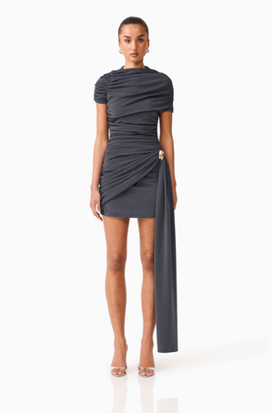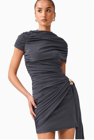 Elevate your wardrobe with the ELLIATT Marisol Set in Charcoal. This sophisticated two-piece features an off-shoulder top with elegantly gathered sleeves, paired with a tailored short skirt. The skirt showcases a striking rouched drape along the hip, finished with a gleaming gold buckle for added glamour. Perfect for nights out or special occasions, this set delivers effortless style and contemporary elegance.